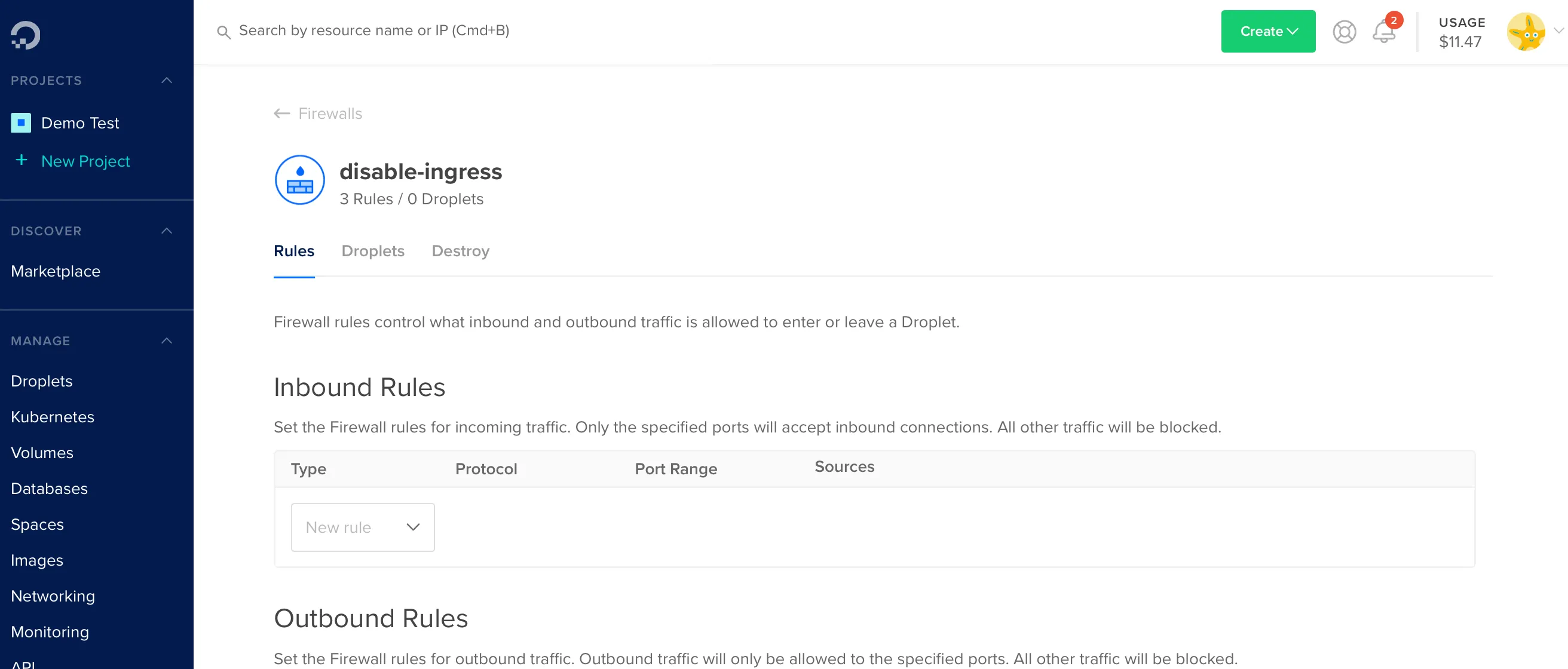 You can now configure your DigitalOcean firewall with a single rule, block any inbound traffic, to prevent direct access.