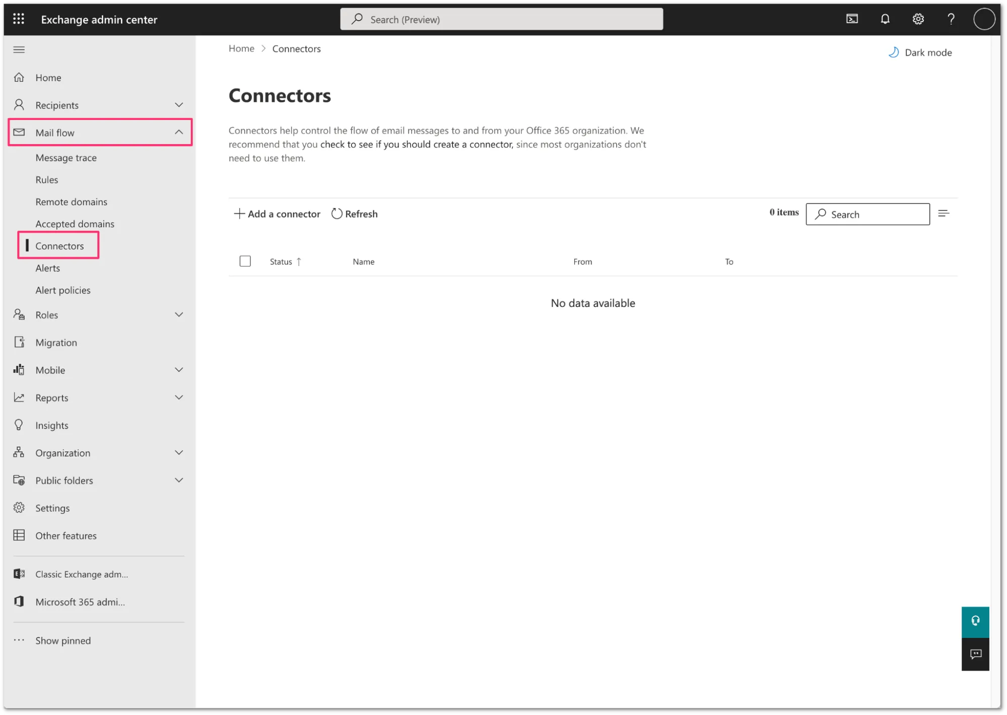 Log in to the Exchange admin center, and go to Mail flow > Connectors.